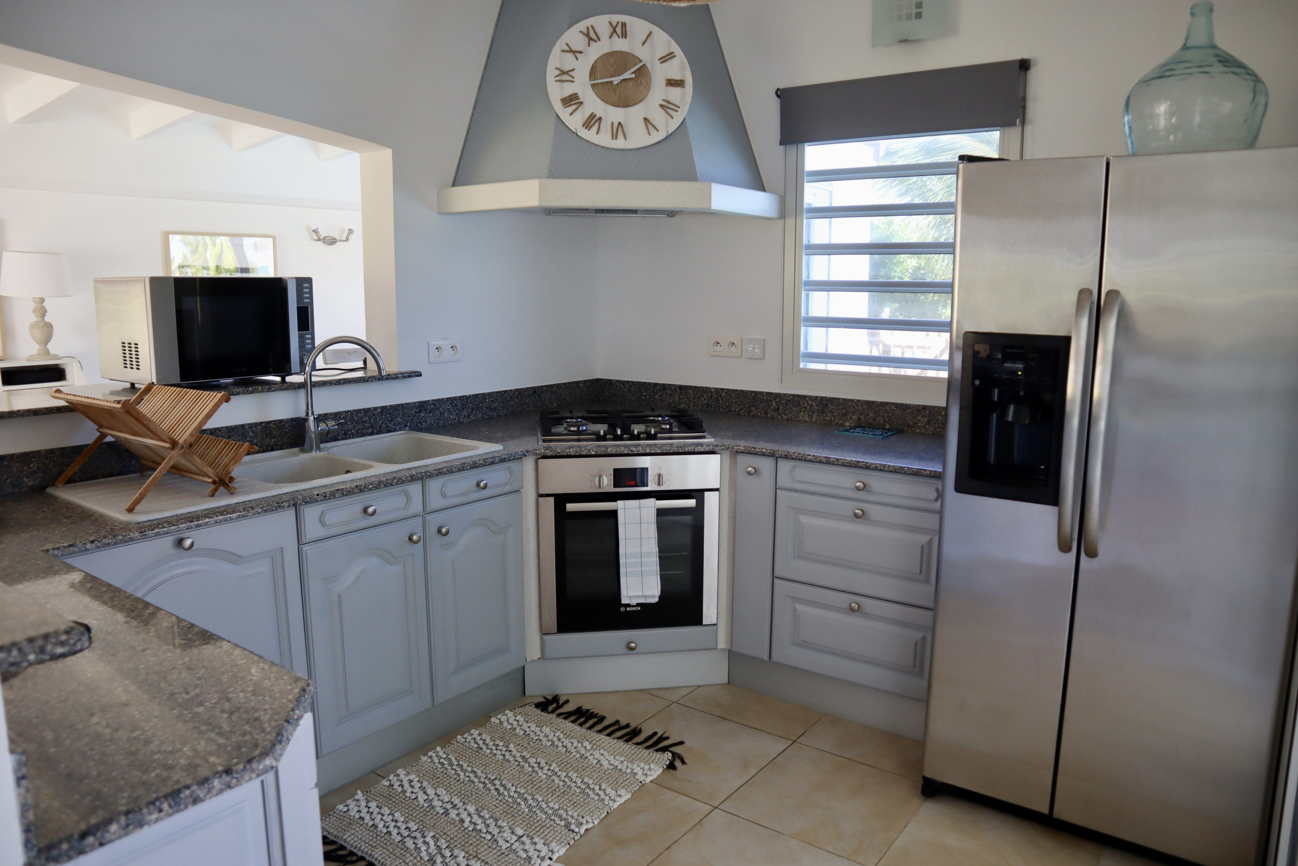 Villa Celina has a large, well-equipped kitchen, with a quick breakfast or lunch bar. The large dining table is ideal for elegant dining, with doors opening completely onto the outdoor terrace and pool.