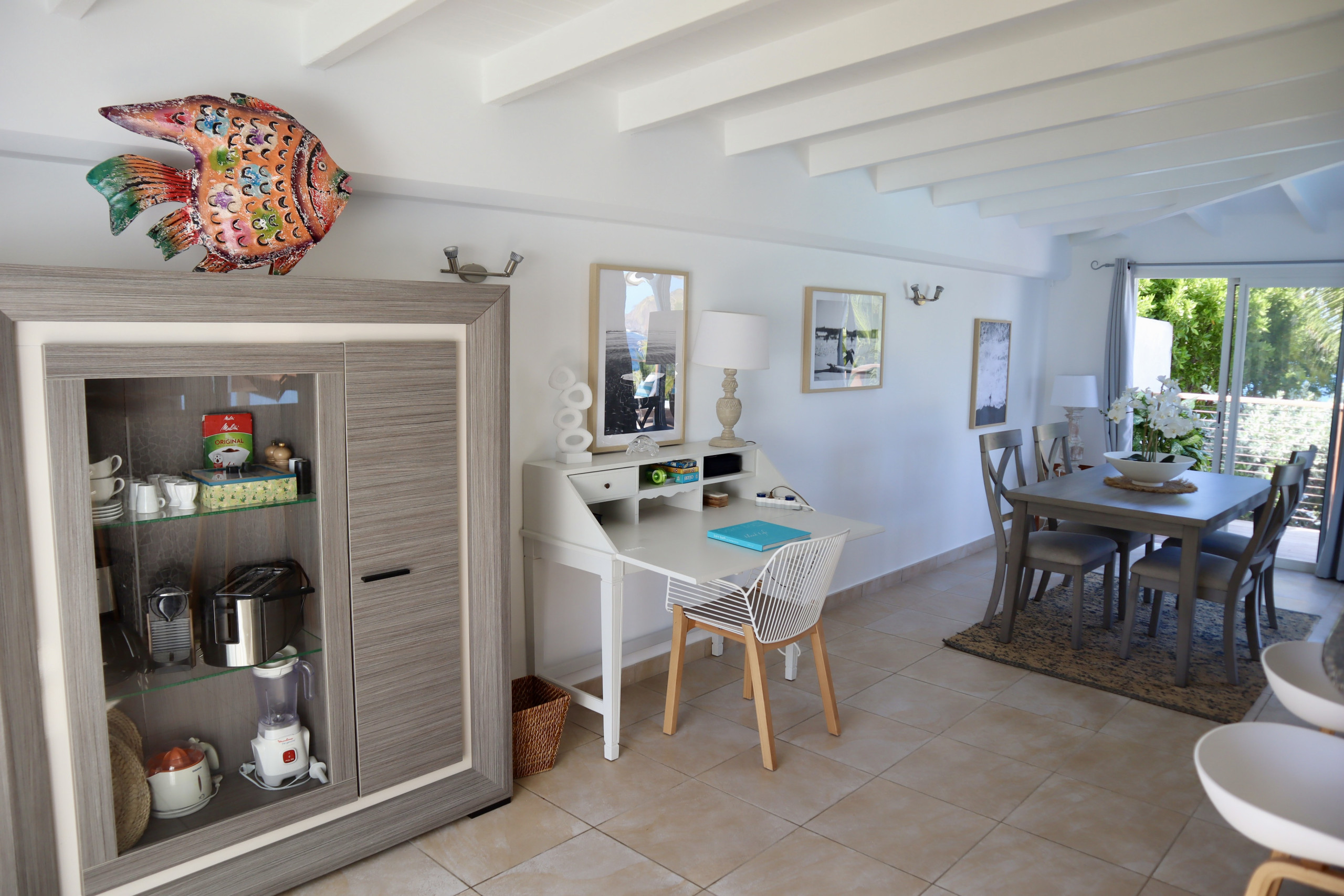 Its private coconut grove borders the beach, and a pathway a few meters long gives you access to the sea, where you can bathe in the turquoise waters of the Caribbean or lie back on the golden sands of the Antilles. You can reach the Flemish restaurants Le Cheval Blanc and La Baie des Anges on a stroll along the beach. You can also walk to the secluded Colombier beach along the coastal footpath.