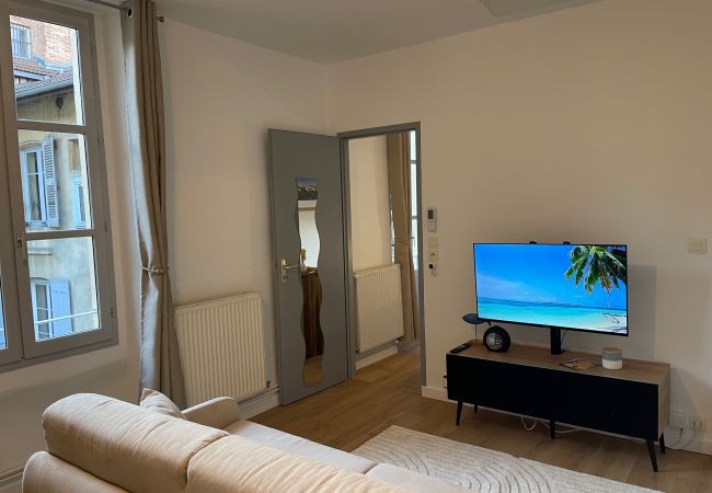 The apartment features a spacious, bright and tastefully decorated living room, furnished with a comfortable, firm sofa, coffee table and TV. The space opens onto a modern, fully-equipped open-plan kitchen (fridge, hob, oven, small appliances, toaster, Nespresso coffee maker (capsules not supplied), etc.), with a bar or dining area perfect for enjoying meals in a convivial setting.