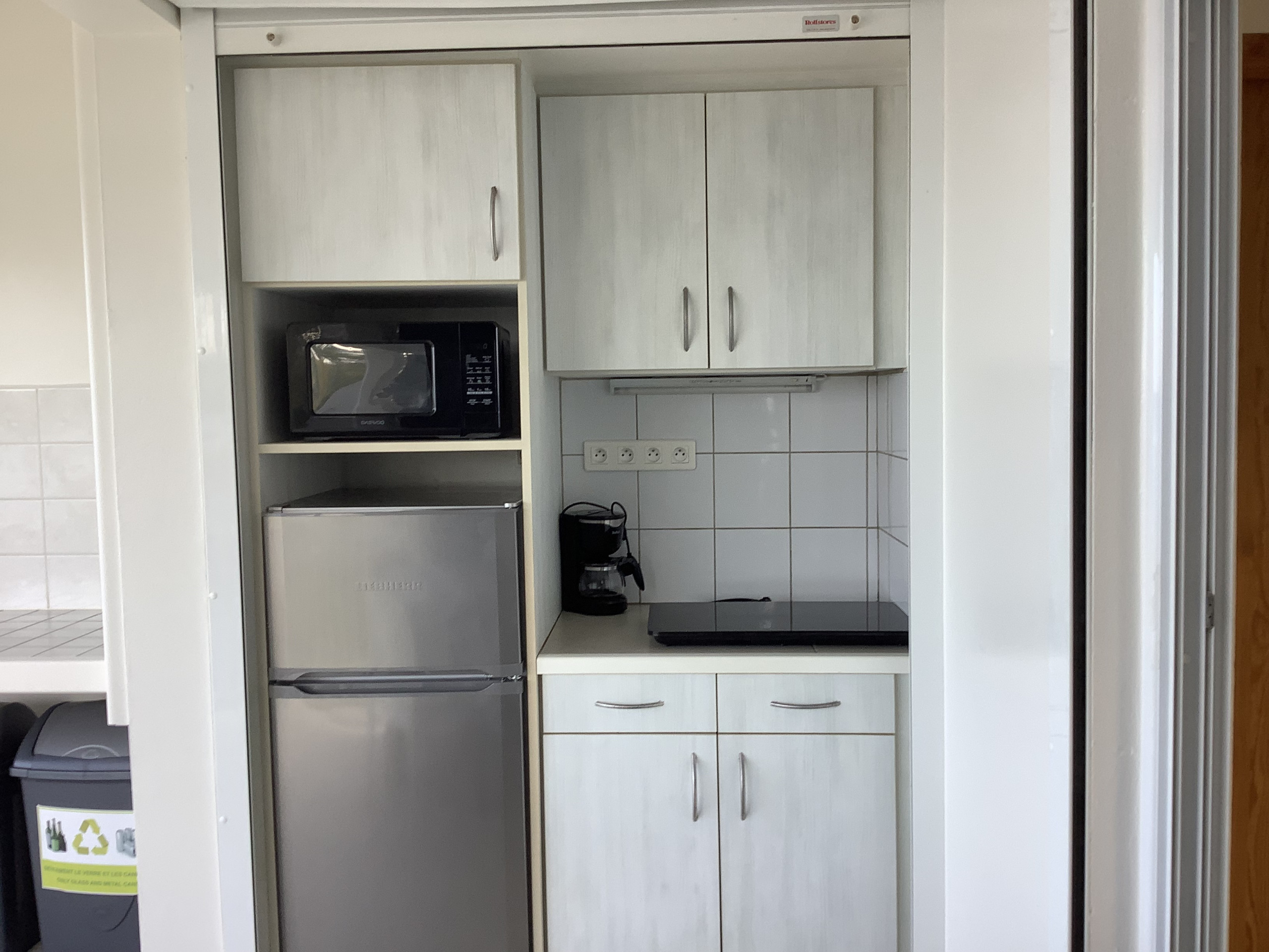 In the induction open plan kitchen, refrigerator, microwave, freezer, dishes/cutlery, kitchen utensils, coffee machine and toaster are provided.