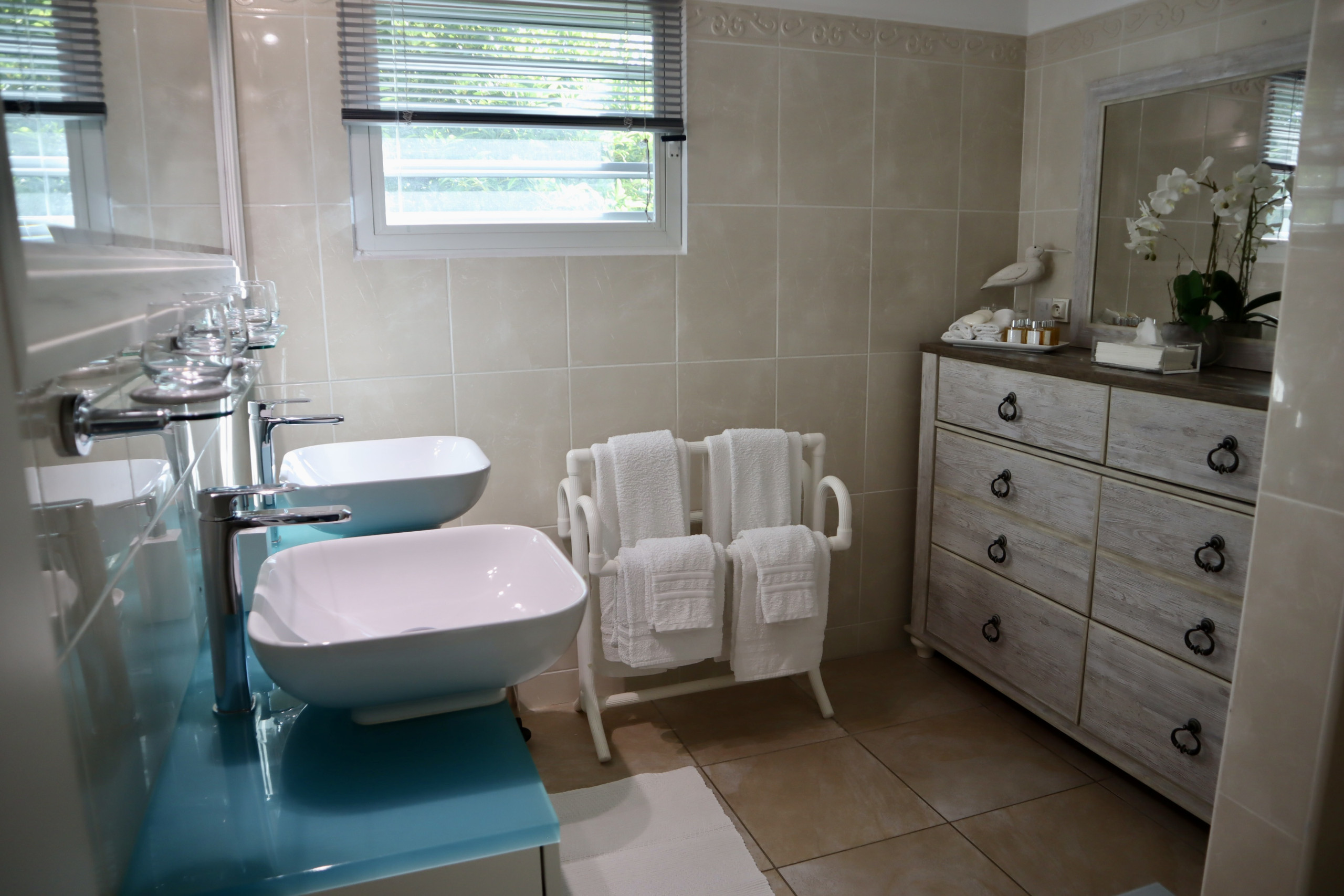 The master bedroom with king-size bed opens onto the pool terrace. The second, with a king-size bed that can be divided into two twin beds, is accessible from inside the villa. Both offer an excellent night's sleep. Both bedrooms share a bathroom.